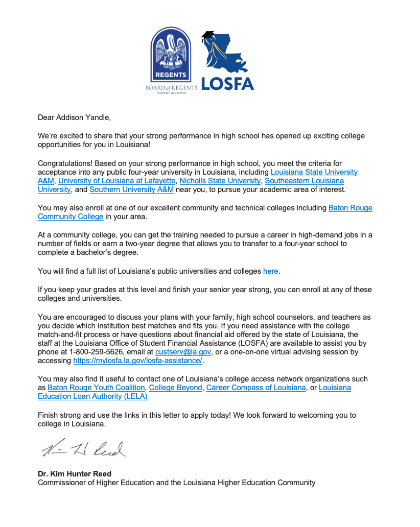 Students are encouraged to review the letters with their families, high school counselors, and teachers as they explore institutions that best match their academic and career goals. Families seeking assistance with financial aid or college planning can contact the Louisiana Office of Student Financial Assistance (LOSFA) at 800-259-5626.